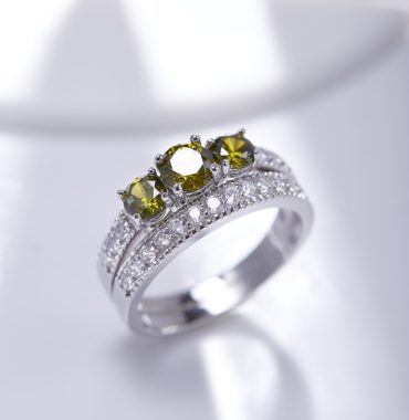Luxurious silver 925 twins rings inlaid with three olive green zircons and side white special crystals